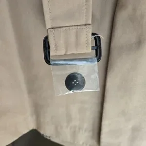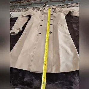 It is a stylish and elegant tan double-breasted coat.