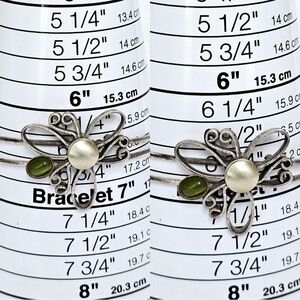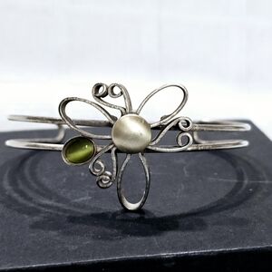 This vintage open cuff pewter nature-inspired bracelet feature a modern flower design with an oval peridot stone. The flower itself is artisan-created from a variety of ovals and scrolls with a solid brushed pewter circle in the middle. The open-cuff bracelet can be adjusted by bending it to fit a little larger or smaller wrist than shown. It will almost certainly be able to bend a little more or less than I did to adjust the size. There is some mottling to the surface of the metal in some places, but otherwise it is considered to be in Good Used Condition. Please see all pictures for details, condition, and size comps.
