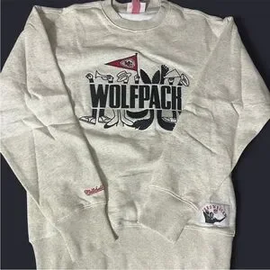 Stylish crewneck sweater by Mitchell & Ness. Features bold 'Wolfpack' graphic. Perfect for casual wear.