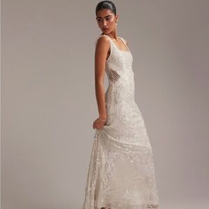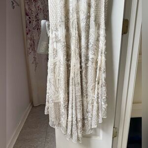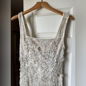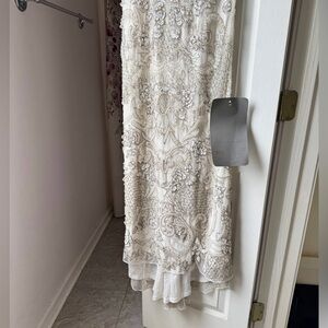 This elegant ivory embellished ornate dress is perfect for a fancy special occasion or as a wedding dress. Its intricate design and flattering fit make it a stunner.