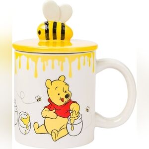 Charming Winnie the Pooh mug featuring a bee lid. Perfect for tea or coffee lovers.
