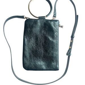Metallic green color faux-leather. Small crossbody style.