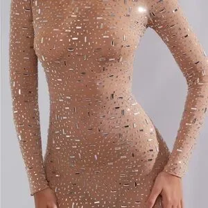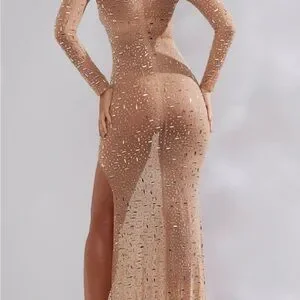 Stunning tan maxi dress adorned with shimmering sequins. Perfect for special occasions.