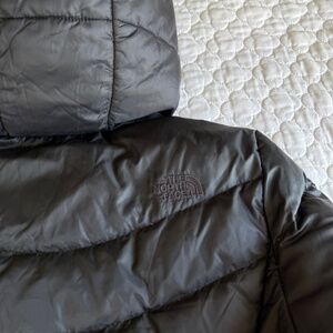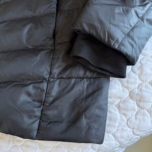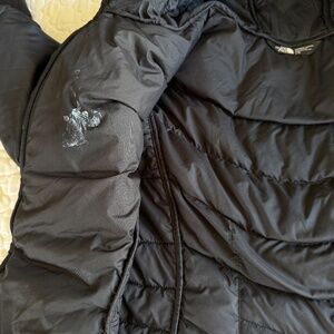 In good shape, one small hole on the right arm and some paint? marks on the right sleeve, bottom right back, and inside. Not too noticeable. Check pics closely.
