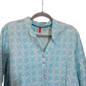 This blue blouse features a boxy silhouette with a notched collar and 3/4 sleeves, offering a chic and versatile style. The button-down design adds a classic touch, making it a perfect addition to any wardrobe. Its lightweight fabric ensures comfort and ease for everyday wear.