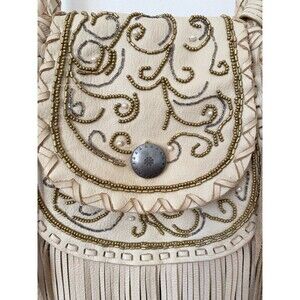 A rare and coveted piece, this Ralph Lauren leather fringe beaded crossbody bag was showcased in the 2011 Western Spring Collection runway show. Now sold out, this luxurious bag is crafted from soft cream deerskin leather, demonstrating Ralph Laurens signature craftsmanship. With its intricate beadwork, embroidery, and fringe accents, it perfectly blends high fashion with timeless elegance.