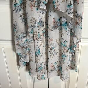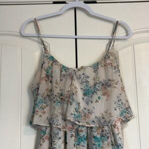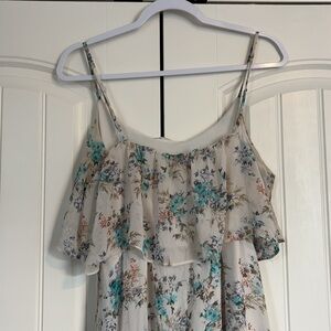 Elegant floral dress with spaghetti straps. Features a flowy design and enchanting floral pattern. Turquoise flowers pop next to the cream dress and neutral flowers. Is a high-low design. Front of dress slightly above knee and long in back. Dress by Disney Cinderella in size XL. Dress is in perfect condition