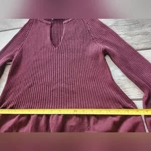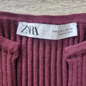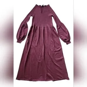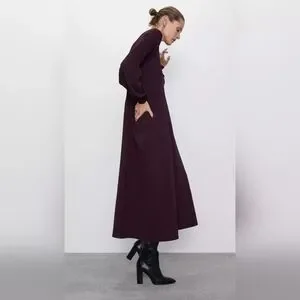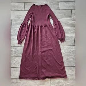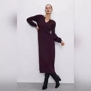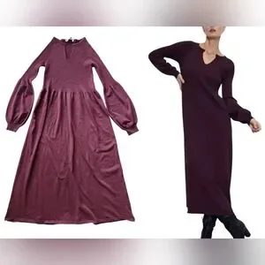 Zara Ribbed Balloon Sleeve Maroon Knit Dress Large Jumper Sweater Maxi Stretch
