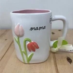 Rae Dunn MAMA Mug White Ceramic Pink Interior Floral Decor Black Lettering New