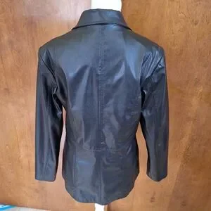 Elevate your style with this sleek black pleather jacket. Perfect for any occasion, this jacket offers both comfort and sophistication.