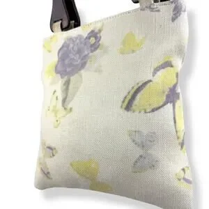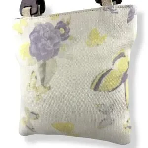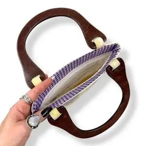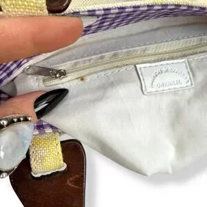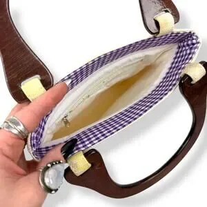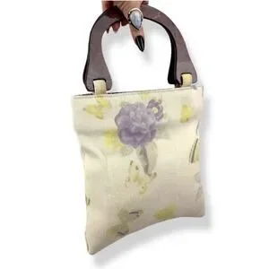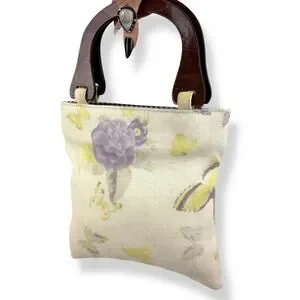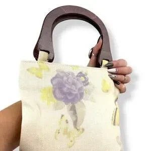 Vintage 1990's woven linen butterfly floral wood handle bag by FASHION EXPRESS ORIGINAL. The cutest little summer bag! Natural linen with yellow and purple printed butterflies and flowers. Gingham purple plain fabric along the top inside. Natural wood handles. Inside is clean white fabric with a small zippered pocket with designer logo. Measures 9.5" along the top, 10" along the bottom, 10.25" tall. Strap drop measures 4.5". My IPhone 16 fits inside perfectly with plenty of room for extras! Excellent vintage condition with some minimal signs of wear, only small flaw to note is a tiny stain in the inside by the pocket (see photo).