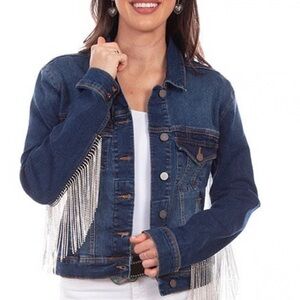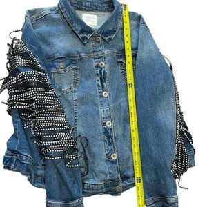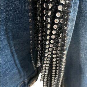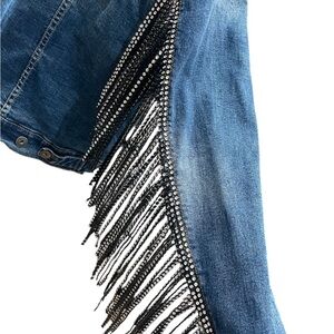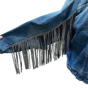 Stylish denim jacket featuring eye-catching rhinestone fringe. Perfect for adding a touch of glamour to your casual look.