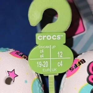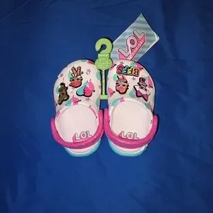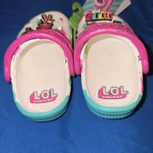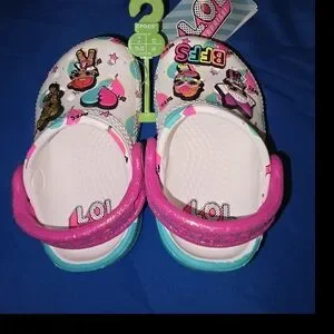 These CROCS shoes boast a delightful design with a white base and charming pink and blue accents, featuring playful cartoon LOL Doll jibbitz. The slip-on style ensures effortless wear, making them perfect for casual outings. Enjoy comfort and fun with every step in these vibrant shoes.