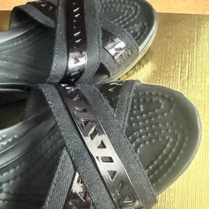 Step into comfort and style with these CROCS black wedge sandals. Featuring a sleek design with multiple crisscrossing straps and an adjustable ankle strap, these shoes offer both support and elegance. The thick wedge sole provides added height and is crafted from durable synthetic material for a modern look.