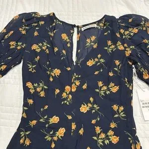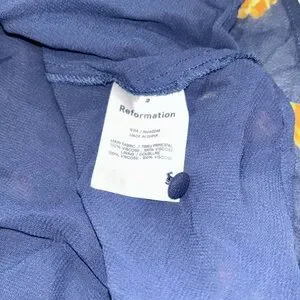 New with tags, Reformation Larchmont dress in Parm print. Fanciful flowers bloom across a vintage-inspired dress styled with the prettiest details: sweetly shirred sleeves, a chic neckline and a flowy, midi-length fit with front slit. Size 2