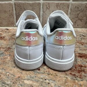 Stylish and comfortable, the Adidas Kids Grand Court 2.0 sneakers feature a sleek white design with iridescent accents. Perfect for everyday wear.