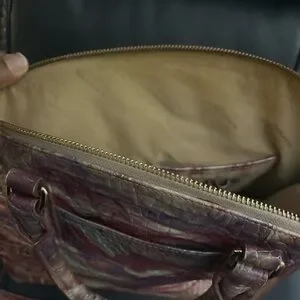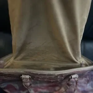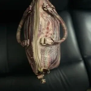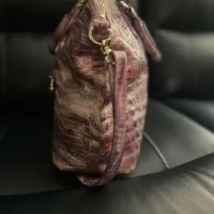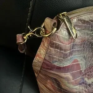 AUTHENTIC Brahmin shoulder bag with a wide base and very ROOMY inside, crafted from a textured material in striking blue and red tones. Strap is adjustable (with tote handles) allowing for comfortable shoulder wear. Interior was cleaned with no rips or tears. Snake skin material.