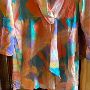 Vibrant Chiffon dress with an abstract pattern. Features a mix of colors for a bold look. So light and summer ready! Size 14