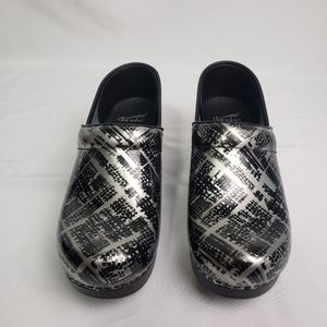 The Dansko Professional Patent Leather Silver Black Block print clog Size 39 / 8.5-9 US (according to Dansko Size chart ) The anti-fatigue rocker bottom assists with forward motion while walking to add hours of comfortable support throughout your day.