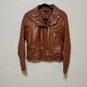 This Love Tree leather jacket features a rich brown hue with gold accents, crafted in a classic motorcycle style with a wide lapel collar and asymmetrical front zipper. The fitted design ensures a sleek silhouette, making it a standout piece in any wardrobe.