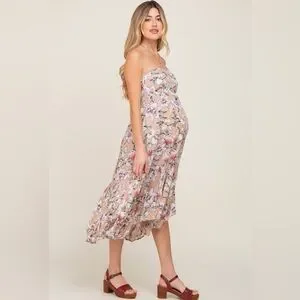 A floral maternity midi dress featuring a strapless top, smocked back, and a handkerchief skirt.