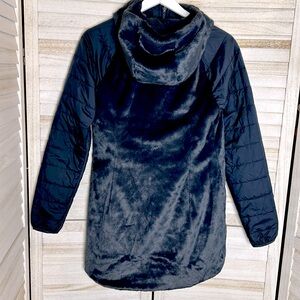 The North Face Women’s Mossbud Insulated Reversible Parka / Coat. Size XS. Color: Urban Navy. Wind-resistant and water-repellent exterior. Quilted pattern on taffeta side. Silky fur-like fleece interior. Completely reversible. Mid-thigh length. Reversible center front zipper. Two open hand pockets on fleece side. Zip pockets on taffeta side. Attached fully lined hood. Excellent pre-owned condition. Material and care instructions included in the pictures. Approximate dimensions when laid flat: Length-29”, Chest- 17.5”, Sleeve (shoulder to cuff)- 20.5”, Waist- 16”.