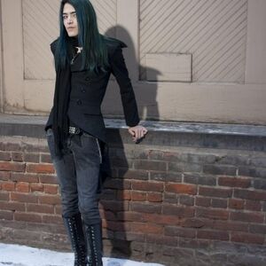Stylish black gothic trench coat paired with lace-up boots. Perfect for a bold look.