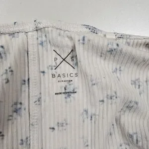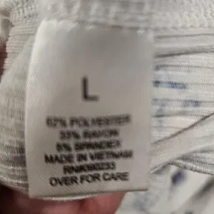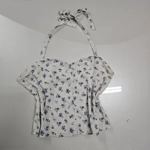 Blue floral print on ribbed fabric. Halter top with tie neck. Size large but fits more like a medium in my opinion