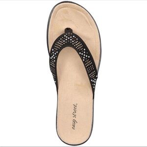 These Easy Street sandals feature a stylish thong design with a decorative black upper, adding a touch of elegance to your casual look. The comfortable footbed ensures all-day wearability, while the low platform sole provides a subtle lift. Perfect for any casual outing, these sandals combine fashion and comfort effortlessly.