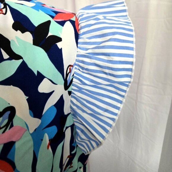 This floral blouse is definitely different. It has ruffles at the neck and gathers at the stripped sleeves. There is a keyhole and button in the back. It's a size xl and is lightweight. All Offers Considered Any questions please feel free to ask Thanks for taking the time to browse 😊 #tags #floral #summer #bright