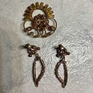 D’eri Demi parure brooch/bolo pendant and earring set. Aquamarine & clear rhinestones. Gold fillers 12k