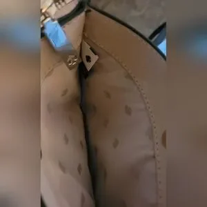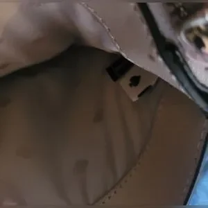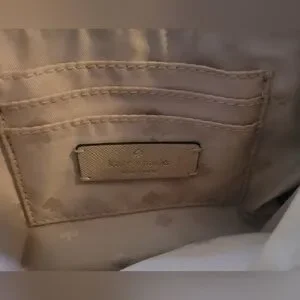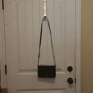 EUC KS bag. Black leather with signature interior fabric. center zipnpicket and two outer snap pockets. clean interior. no callouts. Gold tone hardware and chain strap attachment. with leather strap. 8" x 5.5". 21" strap fro. shoulder to top of bag.