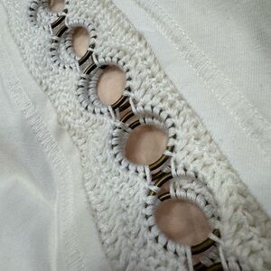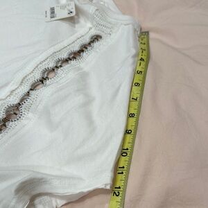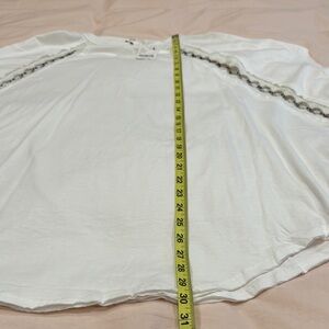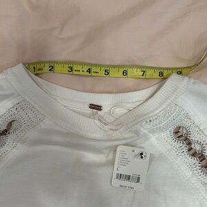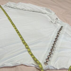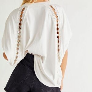 This white t-shirt by Free People showcases a relaxed fit with stylish cut-out details, perfect for a casual, bohemian-inspired look. It offers both comfort and elegance. The clean, fresh appearance is enhanced by its slightly textured finish.