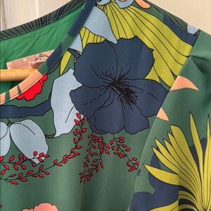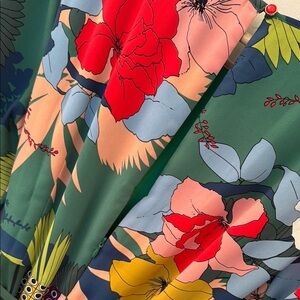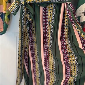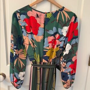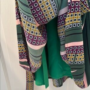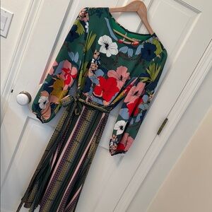 Anthropologie “tp” elegant maxi dress with vibrant multi color, floral pattern on top with deep green background and a geometric circle and stripe pattern on the A-line bottom, button cuffs, button neckline with zipper on back, and attached, tie belt.
