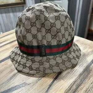 Stylish Gucci bucket hat with iconic monogram pattern. Features a green and red stripe detail. Perfect for adding a touch of luxury to any outfit. Size medium appropriately 22” around.