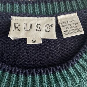 Deadstock Vintage Russ Sweater Vest with Grapes. Green & blue color way with ribbed knit neckline, shoulder cuffs, & hemline. Embroidered x motif across the chest with an argyle type design & bunches of grapes at the bottom. Pullover design. Size small. Approximate measurements lying flat: 17.5” from pit to pit & 24” length from shoulder to hem. Bundle to maximize shipping!