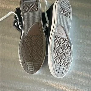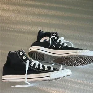 Classic Converse high-top sneakers in black. Features white laces and rubber soles. Like new