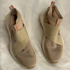 Stylish tan and cream slip-on sneakers with mesh detailing. Comfortable and easy to wear. SOREL beige ceramic Explorer Defy Mid Shoe - Women's size 9.5!