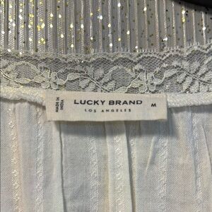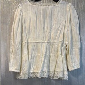 This elegant cream blouse features delicate lace trim and a flattering wrap design. Perfect for any occasion, it offers a sophisticated touch to your wardrobe. Clean smoke free home. Never worn.