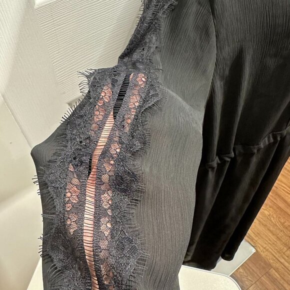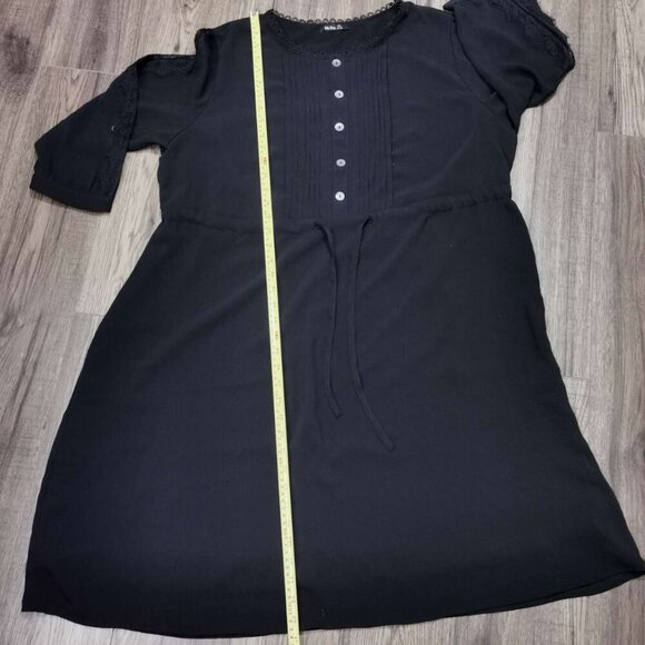 This elegant black dress features a timeless design with delicate lace-trimmed 3/4 sleeves. The pleated front detail and button-down closure add a touch of sophistication, while the adjustable waist tie ensures a flattering fit. The flowy fabric drapes beautifully, making it a perfect choice for both casual and semi-formal occasions GREAT condition