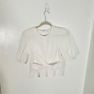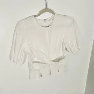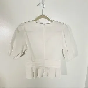 Description: The Veronica Beard Arvilla top features a crisscross front and peplum hem. It has a scoop neckline, short puffed sleeves, fitted silhouette and back zipper. Dress this top up or down - perfect with your full length denim.