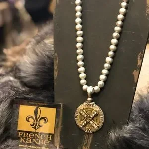 Hi there. The silver pearls are 18” and the medallion is 2.5 “ long. Hope this helps.