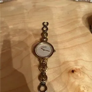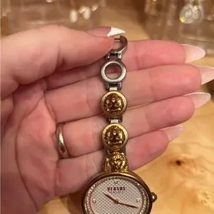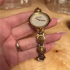 Elegant Versace watch with gold and silver tones. Features a detailed face and iconic design. working battery.