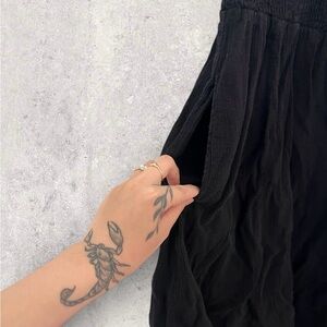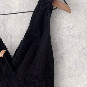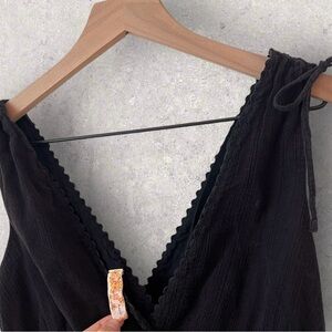 Perfect for Spring/Summer! Features a ruched mid section, pockets, and ties on top of the sleeves. In great condition with no flaws! However, the black color is a little faded due to being washed.