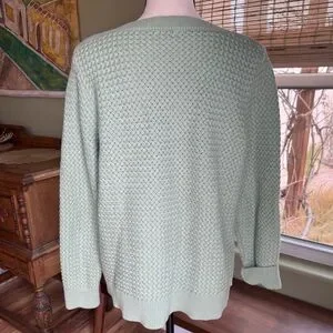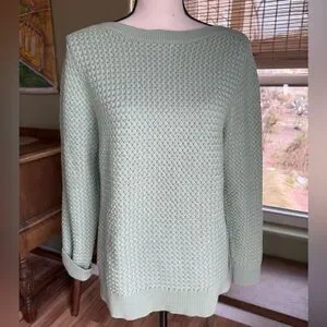 Stay cozy and stylish with this pretty green sweater. Soft and comfy, pre-owned with no stains/pulls/holes. There is some very slight pilling under the arms, but barely. Smoke free home; ships same or next day. Color may appear differently in person than these pictures but the actual color is most like the first picture. 😊