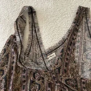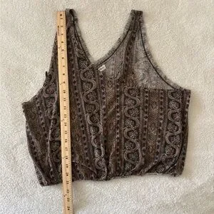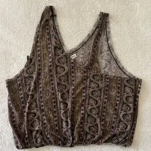 This stylish tank top from We The Free features a relaxed, cropped design with intricate embellishments. The blend of black and brown tones creates a sophisticated look, while the textured fabric adds a touch of elegance. Perfect for casual outings, this top is both comfortable and chic.