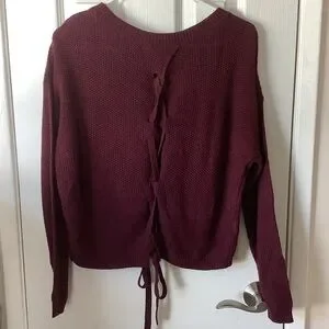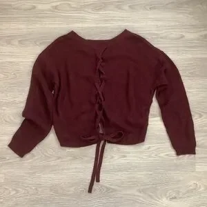 Stay cozy and stylish with this elegant burgundy sweater with a tie-up back. It is cropped and pairs well with high waisted pants.