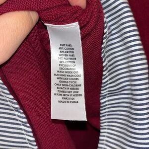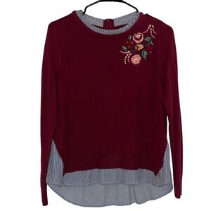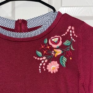 Burgundy Floral Embroidered Sweater with Striped Hem