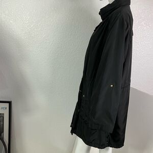 Zips and snaps in the front. side pockets, one inside pocket, a zippered pocket in the back. there is also a hood in the collar.