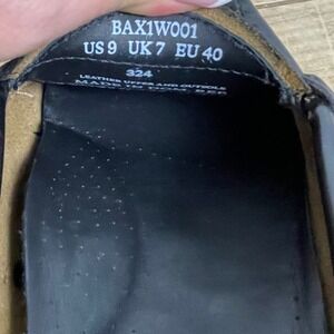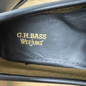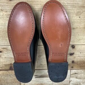 Very Good Condition, Pre-owned, G.H. Bass - Whitney Weejuns Black Leather Penny Loafers- Women's 9Iconic & classic leather loafer crafted in El Salvador. Features include leather upper, leather footbed, classic Moc stitching, "Whale Tail" penny keeper, leather welt, leather stacked heel, beef roll stitching and leather outsole. Discoloration to the inner left shoe on the midsole. Discoloration to the stacked heel of left shoe and several small scuffs tot eh leather of heel cup. Indentation to the leather of the outside midsole of the right shoe. Please see photos for details.